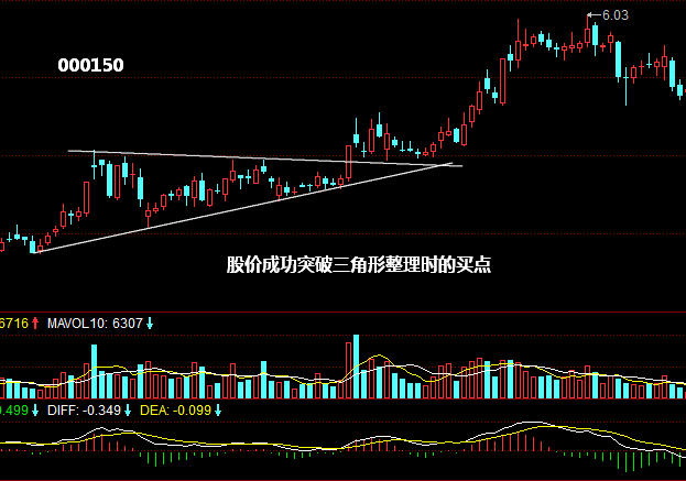 股票上涨后不久就出现了收敛三角形整理的走势,构成了追涨的买人位置,如图9-5所示。