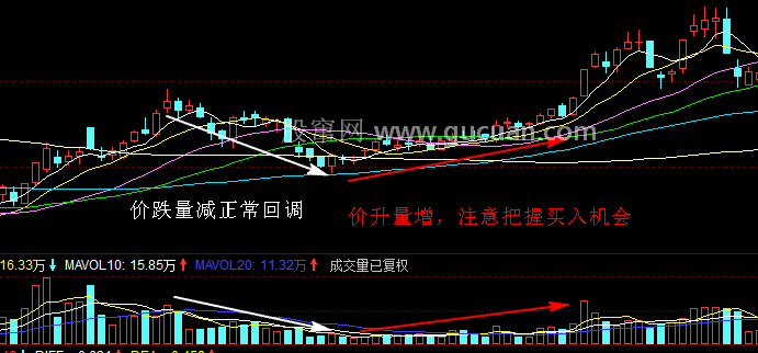 当股价上涨一段后开始回调时,如果出现价跌量减的情况,往往是股价正常回调整理的迹象,表明市场存在惜售心理,同时买入意愿也不足。投资者发现这种走势之后,可以继续持股待涨,空仓投资者需要注意把握调整结束后的买入机会。