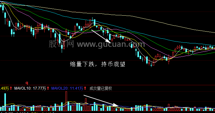 在下跌行情中出现价跌量减的走势时,说明市场承接力度很差,同时卖方力量仍然没有得到宣泄,表示股价仍有下跌空间。这时投资者应该保持观望。