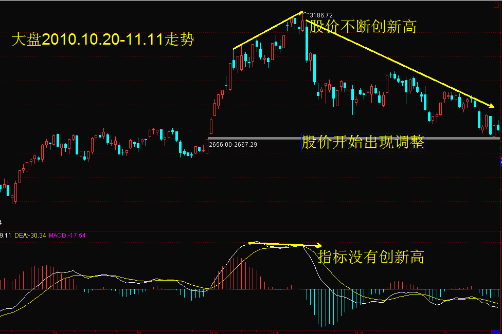 MACD背离 背离分两种,顶背离和底背离 顶背离:K线图上,股价走势一峰比一峰高(股价创新高),而MACD指标不创新高,是一种比较可靠的反转信号,说明股价已到上涨趋势末端,调整随时会到来
