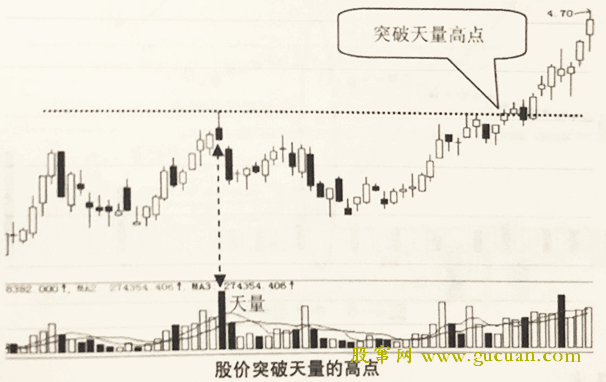 如图所示,这种走势即股价突破前次天量高点的形态。