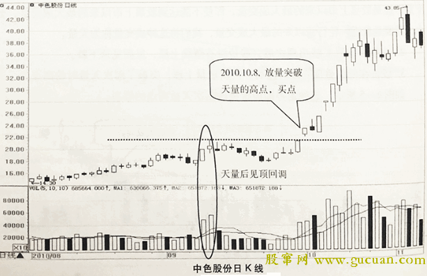 直到10月8日,中色股价再次放量突破了前次天量的高点,这说明之前的阻力位已经被成功突破,股价将持续上涨,买点出现。