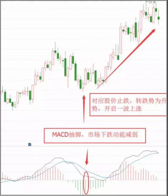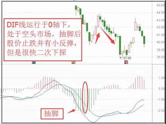 MACD柱状线在0轴下方,在股价下跌过程中,柱状线往往是发散向下,当下跌动能的绿柱达到最大,开始出现第二天柱子短于前一天之时,就是 抽脚 现象,说明市场下跌动力减弱。如下图: