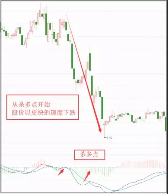 当MACD柱状线在0轴下方运行的过程中,反抽回到0轴,但是并没有突破0轴,之后再度反转向下,开启下一轮下跌,我们就把第二轮发散的第一个柱状线称为 杀多点 。