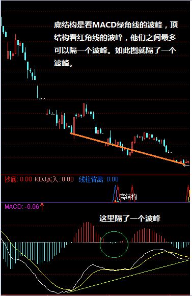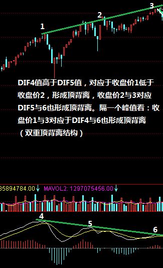 看背离结构,这里以股价与MACD的DIF值为对应关系来说,简单的说:在MACD的两波峰之间,对应股价走高而DIF值走低即形成顶背离,或在MACD的两波谷之间,对应股价走低而DIF值走高即形成底背离结构。大家参看下图: 下图是底背离例: 下图是隔一波峰看背离结构: 下图是顶背离结构,也有隔一波峰看背离,并形成双重顶背离: