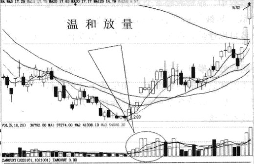 在股市中,大家经常会听到 温和放量 。温和放量一般出现在市场的底部区域,并且在这之前股价出现了一波下跌或者是调整行情。在出现温和放量之前,成交量大多是持续低迷的。随着市场发生变化,成交量开始不断放大,成交量柱状像一座座小山似的逐步堆积起来,呈现出连续放量的形态。温和放量时的成交量一定是逐步地放大,而不是突然放出巨大的成交量。换句话来说,成交量是经过一个量变的过程慢慢地放出来的。因此,有时大家也称为温和放量为 量堆