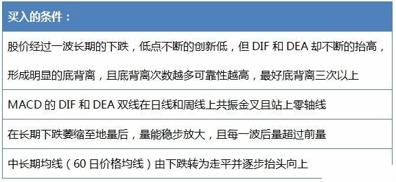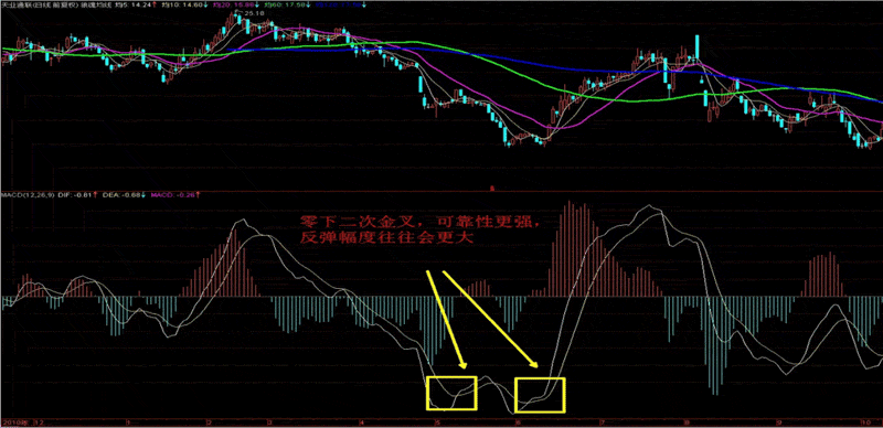 2、 零下金叉:指在DIF和DEA都处于零轴下方时,DIF上穿DEA所形成的金叉。因为当DIF和DEA都处于零轴下时,处于空头市场,此时DIF上穿 DEA形成金叉,一般只是空头市场中短暂的反弹,所以它的稳定度和可靠性都比较低,反弹的力度一般也不大。当DIF和DEA在零下形成二次或多次金叉时, 稳定度及可靠性都会大大提高,反弹力度一般比较大。