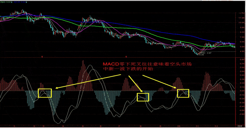2、零下死叉:指在DIF和DEA同时处于零轴以下,DIF下穿DEA所形成的死叉。