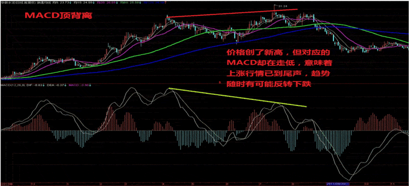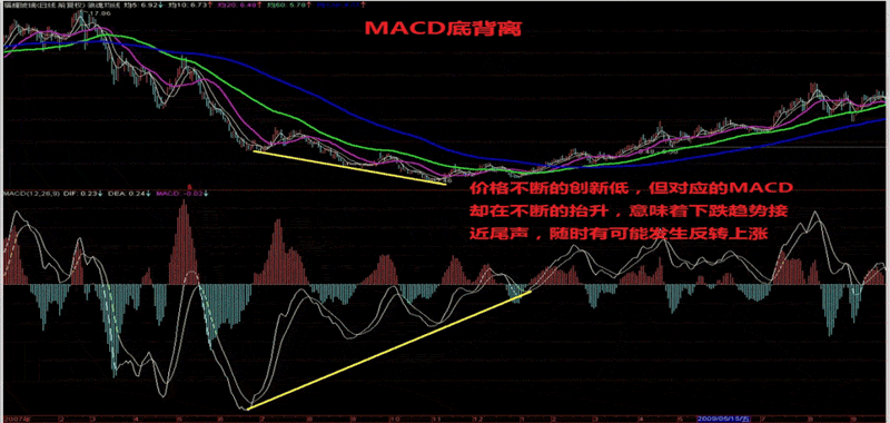 指 当价格不断的创新低时,相对应的MACD指标却并没有相对应的走低,并且没有对价格走势进行有效的验证,而是背离式的走高或者走平钝化。这往往意味着下跌 行情到了尾声,趋势随时有可能反转上涨,底背离的次数越多,反转上涨的可能性就越大,这时候不必盲目割肉,当市场出现明显的放量上涨信号时,就可以反手做 多。