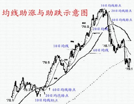 短期均线与中长期均线朝同一方向移动,通常将持续数日或数月才会发生反转,改朝另一方向移动。因此股价从均线下方向上突破,均线也开始向右上方移动,可以看作是买方防线;股价回跌至均线附近自然产生支撑力量,有望再度拉升。短期均线向上移动速度较快,中长期均线向上移动速度较慢,但都表示一定期间内平均成本增加,买方力量若仍强于卖方,股价回跌至均线附近便是买进时机;这是均线的助涨功效,直到买方力量转弱,涨势逐渐缓慢下来。同理股价从均线上方向下突破,均线也开始向右下方移动,成为买方防守线,股价回升至均线附近自然产生阻力,表示卖方力量大于买方,即供给大于需求,成本线逐步降低。因此,在均线向下压迫时,股价回升至均线附近便是卖出时机,均线此时有助跌作用,股价若下跌缓慢或回升,均线开始减速移动,股价若在与均线接近,均线便失去助跌意义,将有重返均线上方的趋势,不需急于卖出。