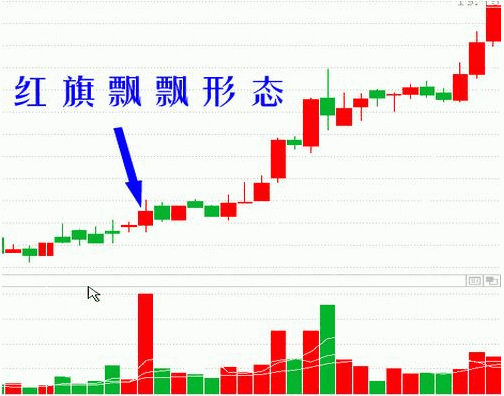 红旗飘飘的概念是某股在低位以放量大阳线的形式向上突破,紧接着几天的K线形式似强势整理,要么是出现几颗星线,要么是小阳小阴的平台组合,其后等待短期均先跟上后,再度上扬的可能性较大。该股的大阳线与星线短期均线构成形状非常向一面红旗,股部分职业人士把这种图形称为红旗飘飘。