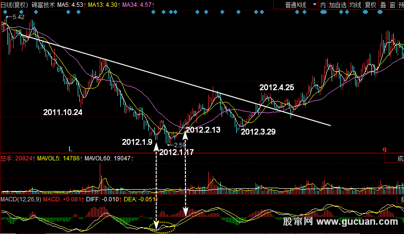 与此同时,MACD指标中的DIFF快线也同步创下了三个阶段新低,不过后一个低点都要高于前一个。至此,MACD指标与股价形成了底背离形态,预示股价即将启动一波反弹走势2012年1月9日,处于底部位置的DIFF快线向上突破DEA慢线形成黄金交叉形态,预示股价反弹将开始。不过此时DIFF快线仍位于0轴下方,且股价仍处于下跌趋势中,因而投资者可考虑少量建仓。2月13日,DIFF快线率先突破0轴,投资者可于此时加仓该股。