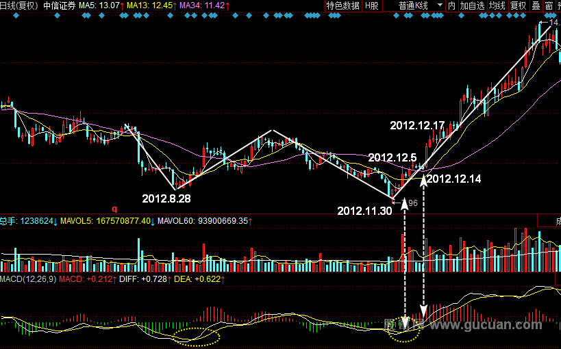 如图所示,中信证券的股价在2012年8月到12月期间出现了W底形态。该股股价分别于8月28日和11月30日创下了阶段最低点,且后一个低点明显低于前一个。