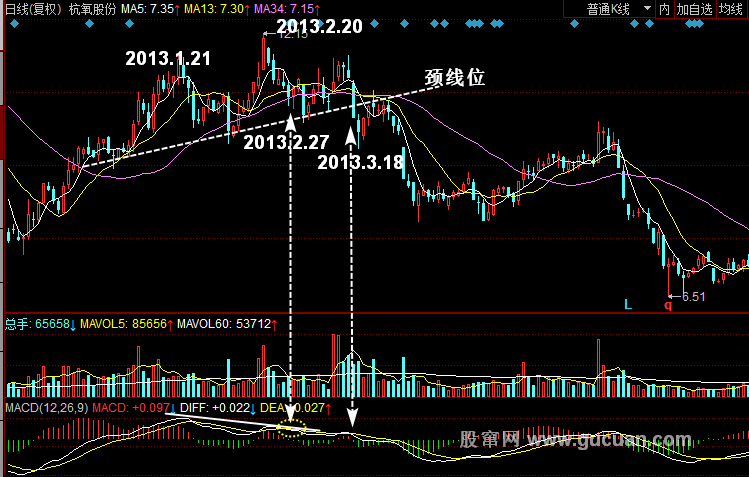 第二,随着股价上涨速度的减弱,DIFF快线与DEA慢线逐渐趋于黏合力。