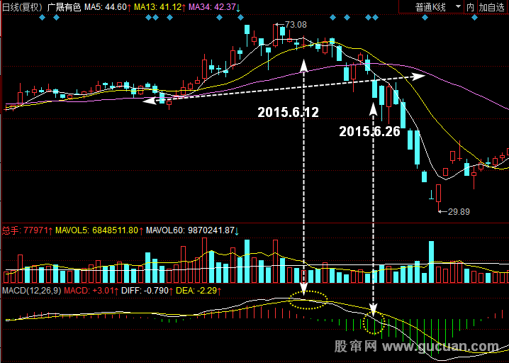 第三,当股价开始缓慢下跌时,DIFF快线率先穿越DEA慢线形成死亡交叉。