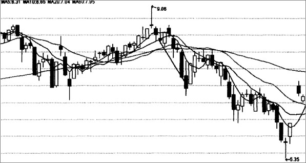 当价格连续缓慢上涨以后,此时市场看多,买盘增加。价格上涨幅度较大,会迅速远离中长期均线,整个均线系统呈现发散状态。中长期均线由于跟不上价格的上涨速度,导致市场在技术上产生巨大的乖离率。当消耗性上升结束后,市场的买盘迅速减轻,而此时看多的人基本都已进场。由于买盘减弱,因此,高位卖盘很轻松就能造成价格的快速下跌,价格出现剧烈震荡。前期买入的人害怕价格一旦在高位下跌,可能使自己套牢,随即多翻空离场止损。于是,价格出现快速下跌,向下方的中长期均线进行主动的快速回档,这就是均线在顶部的主动修复,表明市场见顶,至少也是短线见顶。(如图)