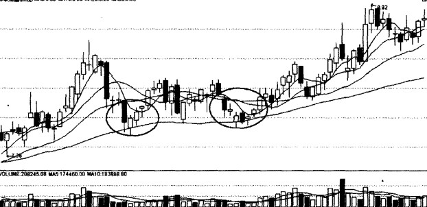 二、被动修复 均线的被动修复是指当价格偏离均线以后,并没有出现主动修复,而是在原地踏步,被动地等待均线向价格靠近。被动修复具体表现为强势整理或下跌抵抗,这种现象一般发生在上涨或下跌的中途,是市场的一种中继信号,一旦均线跟上来以后,价格仍将保持原有的上涨或下跌趋势。 1.上升途中的被动修复 上升途中,价格偏离中长期均线,但多方仍控制市场,导致价格无法深幅回调。一旦下方的均线跟上来以后,由于市场成本趋向一致,价格在消化获利盘以后再度上升。具体表现为:价格上涨后在相对高位原地踏步,回调力度不足,而买盘源源不断,这就是强势整理(如图)