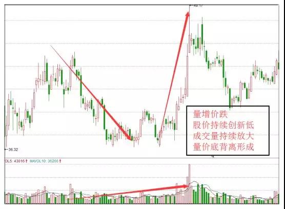 但还有一种情况就是:如果股价连续下跌了很长时间之后,股价有轻微续跌,成交量反而剧增,此时可视为底部渐近,股价近日有望止跌企稳、回升。如下图: