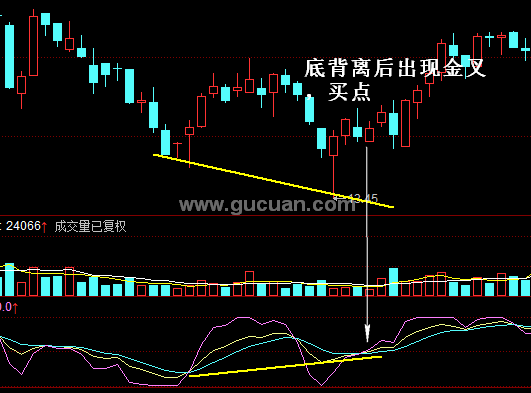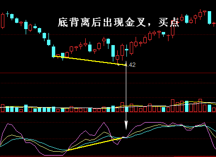 由于技术指标与股价的背离是一种趋势上的反转信号,并不能得出明确的买卖时机,所以投资者在执行买卖操作时,还是要借助其他的技术指标,在大趋势确定的情况下更准确地把握买卖点,实现利润最大化。 KDJ指标中的指标线K与股价形成底背离走势,一般出现在震荡行情中的下跌走势中,也有可能出现在股价在底部启动时,KDJ指标金叉的出现预示着股价的下跌走势结束,上涨走势即将开始,所以投资者可以依据KDJ指标金叉选择适宜的买点(如图所示)