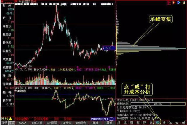 如华电国际,既没有出现大幅的上涨,也没有出现大幅度的下跌,主要围绕7.6元一线波动。经过长时间的换手后形成了单密集峰的形态。