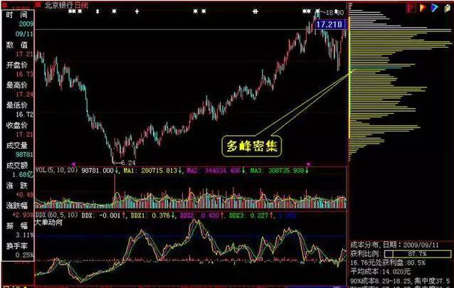 如北京银行即是上涨多峰的形态。在去年快速杀跌至6元上方,买方主力开始大量买入,DDX三线在去年9月份上穿0轴后一直在上方运行,显示主力连续建仓买入,建仓完毕后开始不断拉升,拉升过程**现了多次的横盘整理。而在图形上也形成上涨多峰的多峰密集形态。