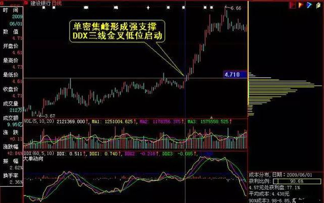如建设银行的移动成本分布图形。从图上看,该股在经过2008年的大跌后长时间筑底,在4.7元以下形成了明显的上升三角形趋势。但由于主力资金始终压制价格低位买入,股价未能形成向上突破。在上升三角形整理进入末端的时候,成本分布上形成了非常明显的低位单密集峰支撑,蓄势非常充分。在6月1日DDX出现大红柱,三线开始金叉上行后,股价终于迎来了爆发的时机。
