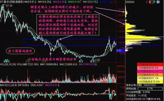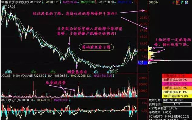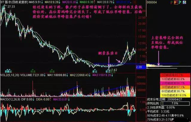 筹码峰的转移就是庄家运作股票的全过程,对于一个头上还有筹码峰没有割肉下来、股价还在创新低的股票,不是我们要关注的目标,必须得等到股价头上的筹码峰割肉完毕,底量超顶量,后量超前量,低位单峰密集、底部抬高了,就是我们关注的区间。