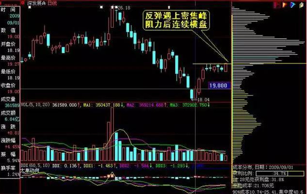 如深发展,出现了连续5根小实体K线的横盘走势。原因正是在经过三天的大反弹后已经遇到了上密集峰的压力。横盘正是为了消化压力出现的结果。