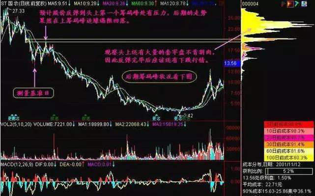 2、中间白颜色的线为目前市场所有持仓者的平均成本线,表明整个成本分布的重心。如股价在其之下,说明大部分人是亏损的。