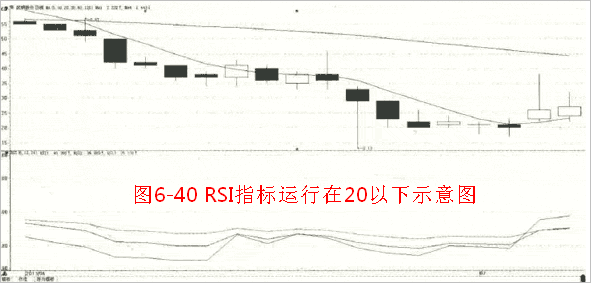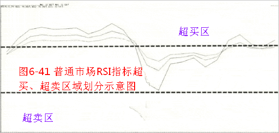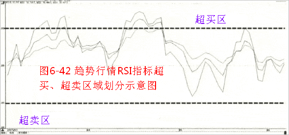 RSI指标可以直白地体现出市场处于超买、超卖状态。通常情况下,RSI指标70以上的区域可看作超买区,30以下的区域可看作超卖区(如图6-41所示)。当市场行情波动较大或者将要形成明显的趋势行情市场的时候,RSI指标中的80以上的区域可看作超买区,20以下的区域可看作超卖区。(如图6-42所示)