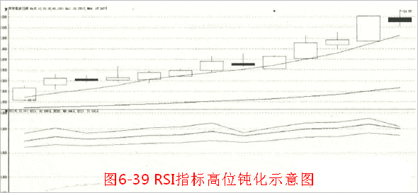 无论是牛市还是熊市,RSI指标经常会上升到90以上区域或下降到10以下区域,当RSI指标到达这两个区域时,即所谓的RSI指标钝化,这个时候的RSI指标传递出的信息极有可能是误导信息。此时参考RSI指标投资,新股民朋友就很可能会错过套利良机或被套在高位。
