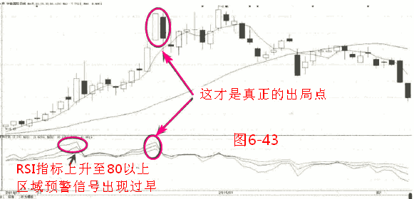 2014年11月中旬华能国际(600011)的RSI指标上升至80以上的区域,发出预警信号,但是结合该股K线走势图可以看到,此时并不是最佳的卖出时机。随货该股的RSI指标经过小幅回落后,再次上升至80以上区域,这次预警信号才是真正有参考价值的信号(如图6-43所示)
