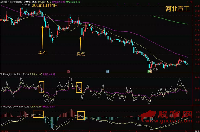 2、MACD、RSI同时段死叉:为卖出信号;