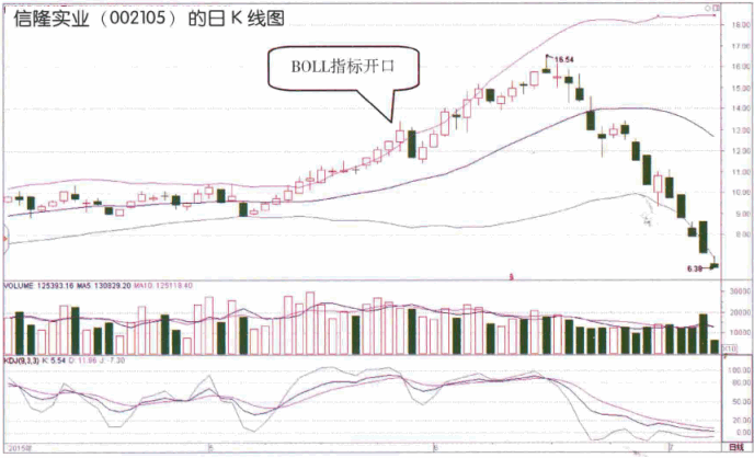 下轨下方的区间:代表行情强势下跌的区间。股价只有在强势下跌时才会进入这个区间,但是这种下跌不会持续太久时间。波动幅度的指示 BOLL指标上轨和下轨之间的轨道宽度,可以代表股价的波动幅度。轨道开口的幅度越大,就说明股价波动的幅度越大。 如图所示,从2015年5月起,信隆实业(002105)股价上轨和下轨之间的开口逐渐拉大。这样的形态说明该股进人了强势上涨趋势中,并且上涨的速度越来越快。