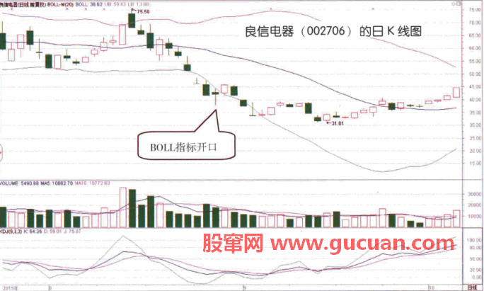 如图所示,2015年8月,良信电器(002706)股价在持续下跌的过程中,其BOLL指标的开口逐渐打开,这说明该股处于持续的下跌趋势中,并且未来的下跌速度会越来越快。