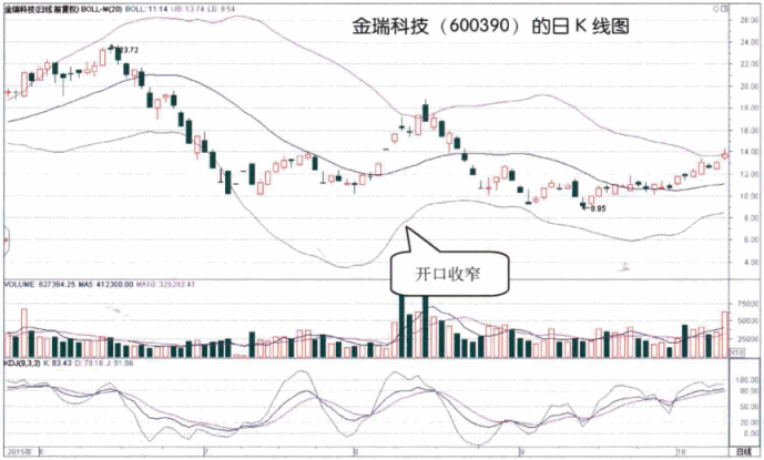 如图所示,2015年8月,金瑞科技(600390)股价在经过快速下跌后,其BOLL指标开口逐渐收窄,这是股价波动幅度减小,快速下跌行情即将结束的信号。看到这样的信号后,投资者可以寻找在底部抄底买人股票的机会。