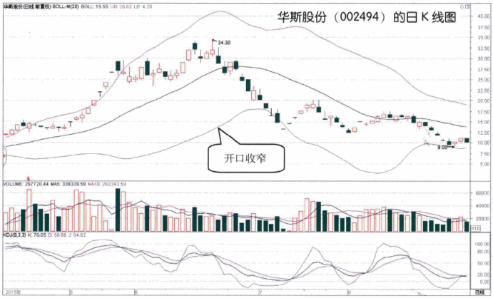 如图所示,2015年6月底,华斯股份(002494)股价在持续上涨至高位后,其BOLL指标开口逐渐收窄,这是持续上涨行情结束,股价即将见顶下跌的标志。看到这样的形态后,投资者应该注意股价见顶的风险。