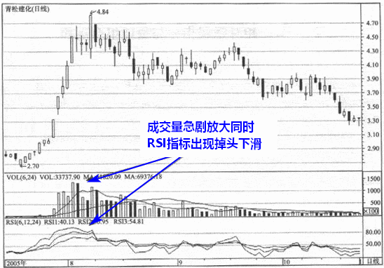 相对强弱指标与成交量组合运用的核心原则:股价大幅上涨之后,成交量急剧放大的同时相对强弱指标出现掉头下滑,表明市场行情即将出现见顶回落走势。   一般情况下,当市场见顶或见底的时候,技术指标常常会显示种种迹象。市场见底之前,伴随RSI指标的低位徘徊,成交量会迅速减少(如图所示)。 一般情况下, 市场见顶的时候,由于多头获利回吐以及散户被市场热烈气氛迷惑而高位盲目追涨,导致成交量迅速上升,而RSI指标却在成交量急剧放大同时出现掉头下滑,这时表明市场行情即将出现掉头下跌走势。(如图所示)