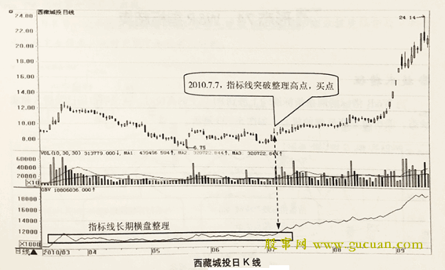 OBV指标先是在一个很小的区间长期横盘整理超过三个月,之后指标线突破了横盘整理的高点,开始持续上涨,如图所示。