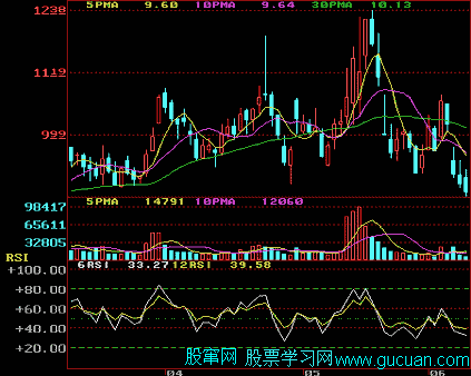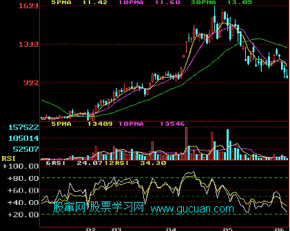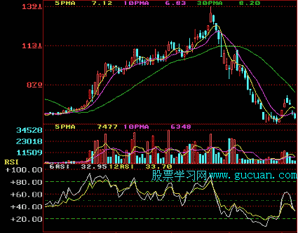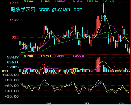 2.白色的短期RSI值在80以上,由上向下交叉黄色的长期RSI值时为卖出信号。(见下图)