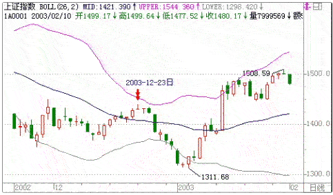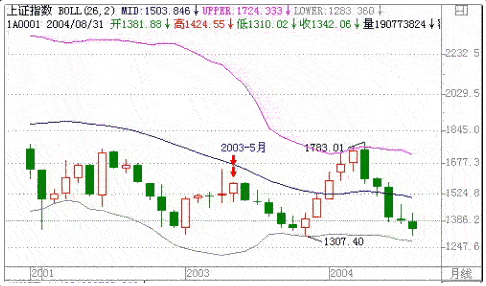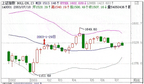 以上证指数周线为例,2002/3/8日上证指数上涨到BOLL线的中轨线上,由于中轨线向下,上证指数在中轨线上下盘整了9周后选择了向下的方向,如图1所示。2003/1/29日上证指数上涨到中轨线处,上证指数向下沿着中轨线盘整了7周后选择了向上的突破方向,如图2所示。