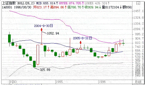 月线的例子很少,1994/9/30月线上涨到中轨处后,指数就沿着中轨上下震荡20个月后选择了向上的突破方向,在这段时间内1995/8/31指数比较理想地沿着中轨线盘整了四个月,如图3所示。