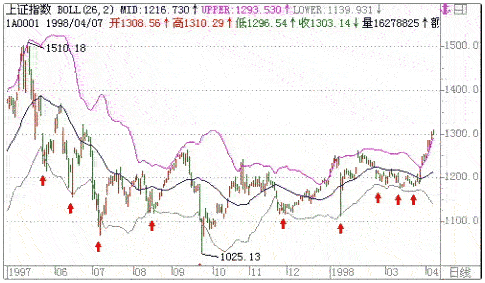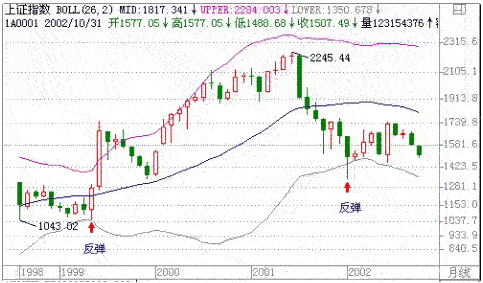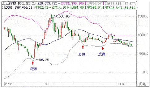 当指数(股价)下跌到下轨时,总有一定的支撑力,常能引起反弹。分析周期越长,反弹的机率越高