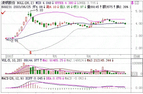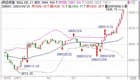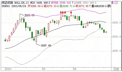 今年深成指和上证指数的BOLL周线刚好打开上升通道后回落,特别是深成指表现尤其明显。如果深成指回落到中轨处(目前在3132点附近)或者上证指数回落到中轨上(目前是1498点附近),从纯技术来讲这是很好的形态,是很好的买入点。但由于今年的特殊情况,非典的打击,资金的匮乏,再加上对国家队是否入场的疑虑,为了安全,最好当两市股指跌到中轨线时应该观望一下,看有无利好或者新的资金入场,并且还注意考虑已过六月,季节较晚也应该是一个考虑因素。总之笔者一直认为只有两市下跌到周BOLL线的中轨时才有大的获得机会,进不进场,要看当时的走势而定。