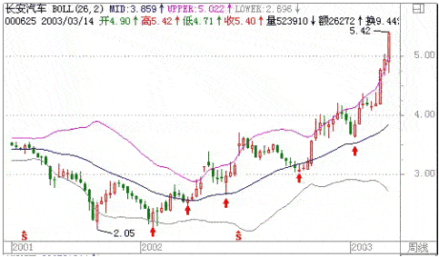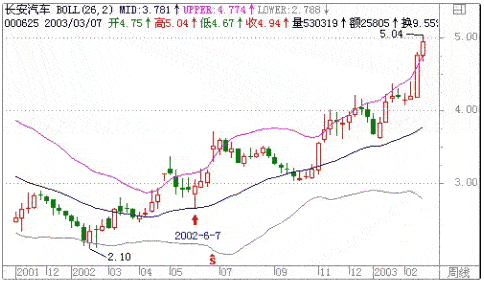 600104上海汽车,在复权状态下,在周线下,2002/6/8日上攻过上轨,第一次打开了上轨,随后股价盘整下跌到中轨附近很长一段时间,走到2003/1/10摸下轨后上涨到上轨处,经过几周的小阳后促使上轨线向上弯曲,第二次打开了上升通道,直到2003/1/29日小幅回调后(满足日线法则六)沿着上轨的方向上涨,在2002/5/23日见顶。