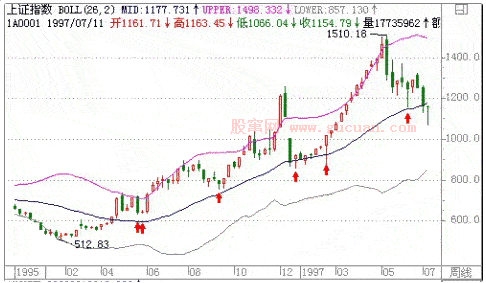 上证指数在过去的大牛市中(例如96~97年),每次指数回落到周线的中轨线上时都是好的介入点。