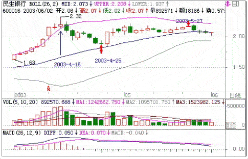 600016民生银行,4/16日大涨以后从上轨下跌到中轨线上(4/25),然后缩量反弹盘升到5/27日,又在上轨附近不能放量上攻突破上轨线,次日选择了向下回落,在中轨处盘整一周以后跌破中轨,大势已去也。见顶形态十分明显。如果把KDJ,MACD,以及VOL线一起看,顶部信号早就一清二楚,如图14所示。