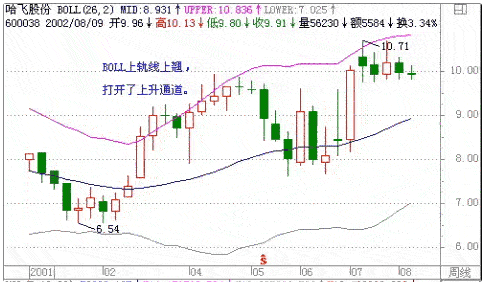 在周线上当股价(指数)在低部筑了相当长一段时间以后上涨到上轨处时造成了上轨线逐渐弯曲向上打开了上升通道,然后又回落到中轨上(或者下轨上),如果时间在上半年的资金充沛期,股票的上涨可能性较大。日线在较小周期内也满足这个法则。