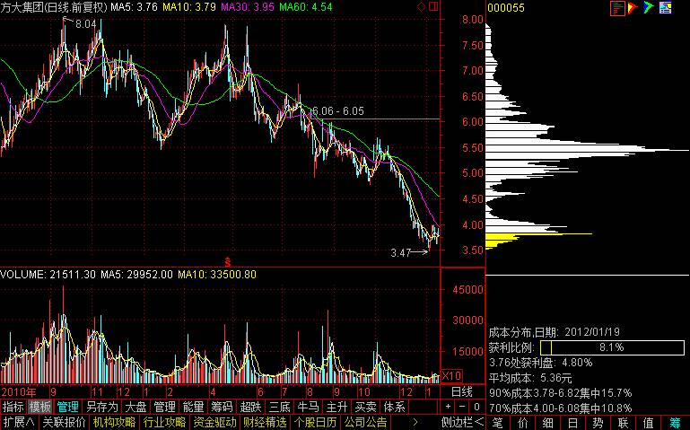 方大集团前期股价虽然一直下挫,但上方套牢筹码始终没有减少,则趋势依然下跌。