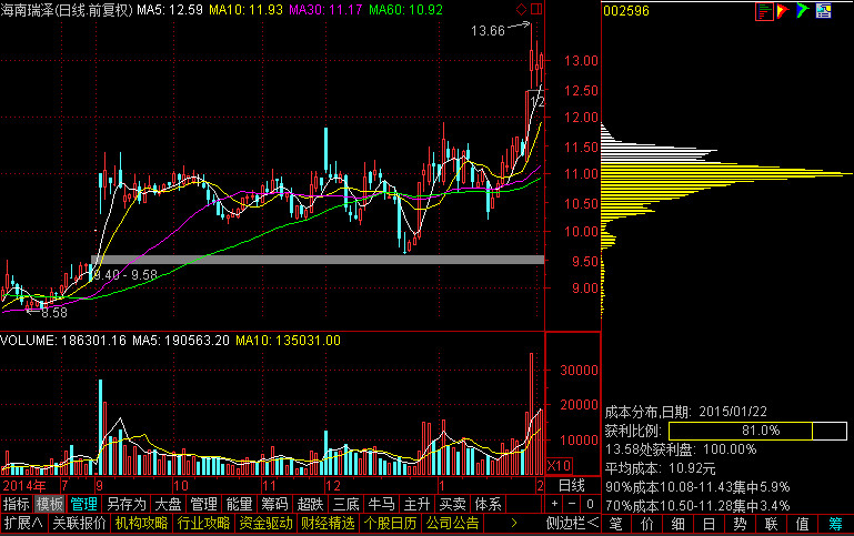 海南瑞泽形成单峰密集后,股价放量突破单峰密集,向上趋势展开。